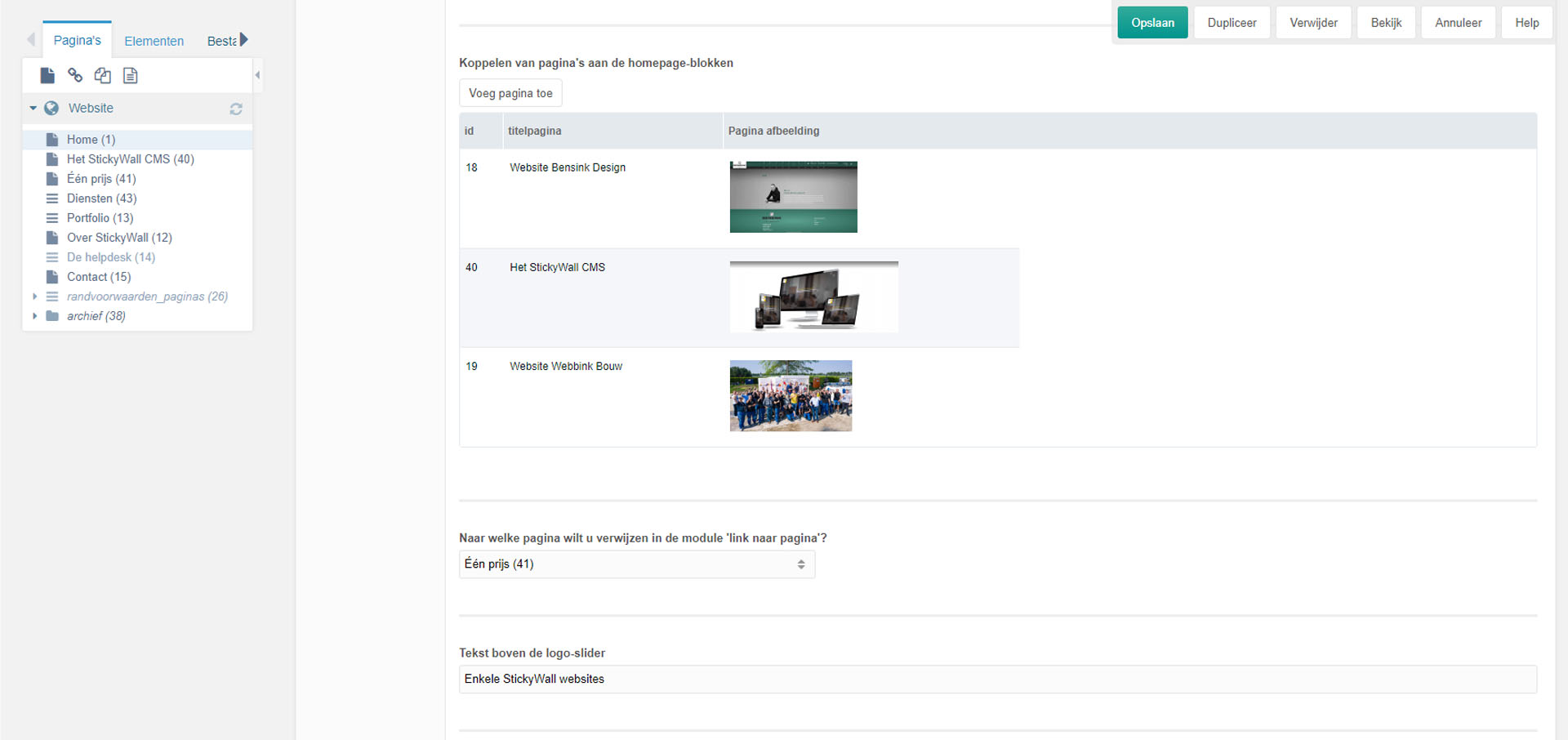 De homepage is als het ware de voorpagina van de website. Daar komt de klant vaak bij u binnen, daar vind hij direct al de belangrijkste informatie in het kort, met de mogelijkheid om meer informatie te vinden over specifieke onderwerpen. Welke onderwerpen dat zijn, bepaalt u zelf. Het STICKYWALL CMS zorgt voor de vorm, u zorgt voor de inhoud!